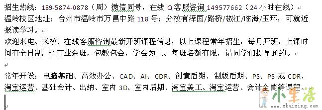 温岭校区地址:台州市温岭市万昌中路118号;分校有泽国/路桥/椒江/临海/玉环,可就近报读学习。