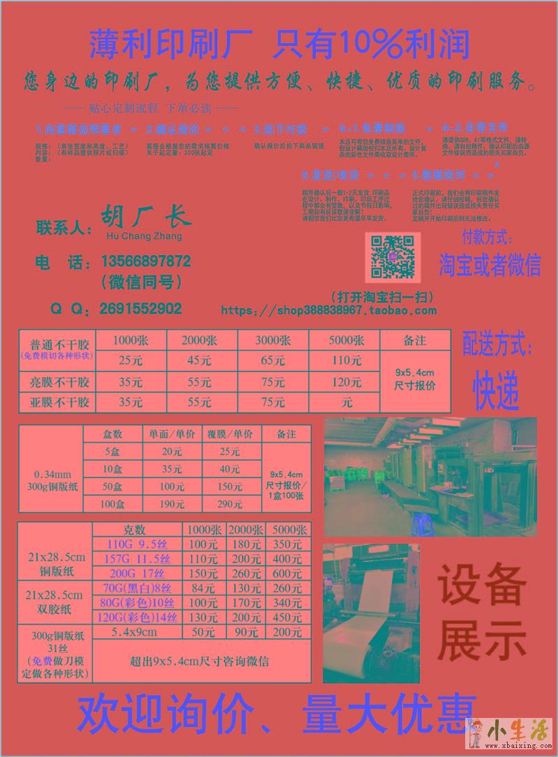 你如果有印刷资源的业务可以介绍过来,你可以赚差价小.生.活.网。 如果你自己厂的印刷业务,可以对比下价格x_b_a_i_x_i_n_g_c_o_m。印刷产品价格低的,你想不到的x+b+a+i+x+i+n+g+c+o+m。利润基本就是养工人的来自www.xbaixing.com。联系人;胡厂长 xbaixing.com。联系咨询电话;13566897872【微信同号】微信有更多的图片小.生.活.网。印刷产品有;各种不干胶材料,服装吊牌,处方签,工厂流转卡原文www.xbaixing.com。说明书,联单【1白,2红色,3蓝色,黄色4,绿色5,联】画册等等
