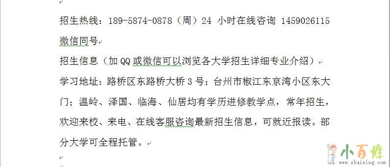 学习地址:路桥区东路桥大桥3号;台州市椒江东京湾小区东大门;温岭、泽国、临海、仙居均有学历进修教学点,常年招生,欢迎来校、来电、在线客服咨询最新招生信息,可就近报读。部分大学可全程托管www.xbaixing.com。