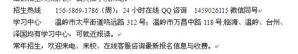 学习中心 温岭市太平街道鸣远路312号;温岭市万昌中路118号;临海、温岭、台州、泽国均有学习中心,可就近报读。