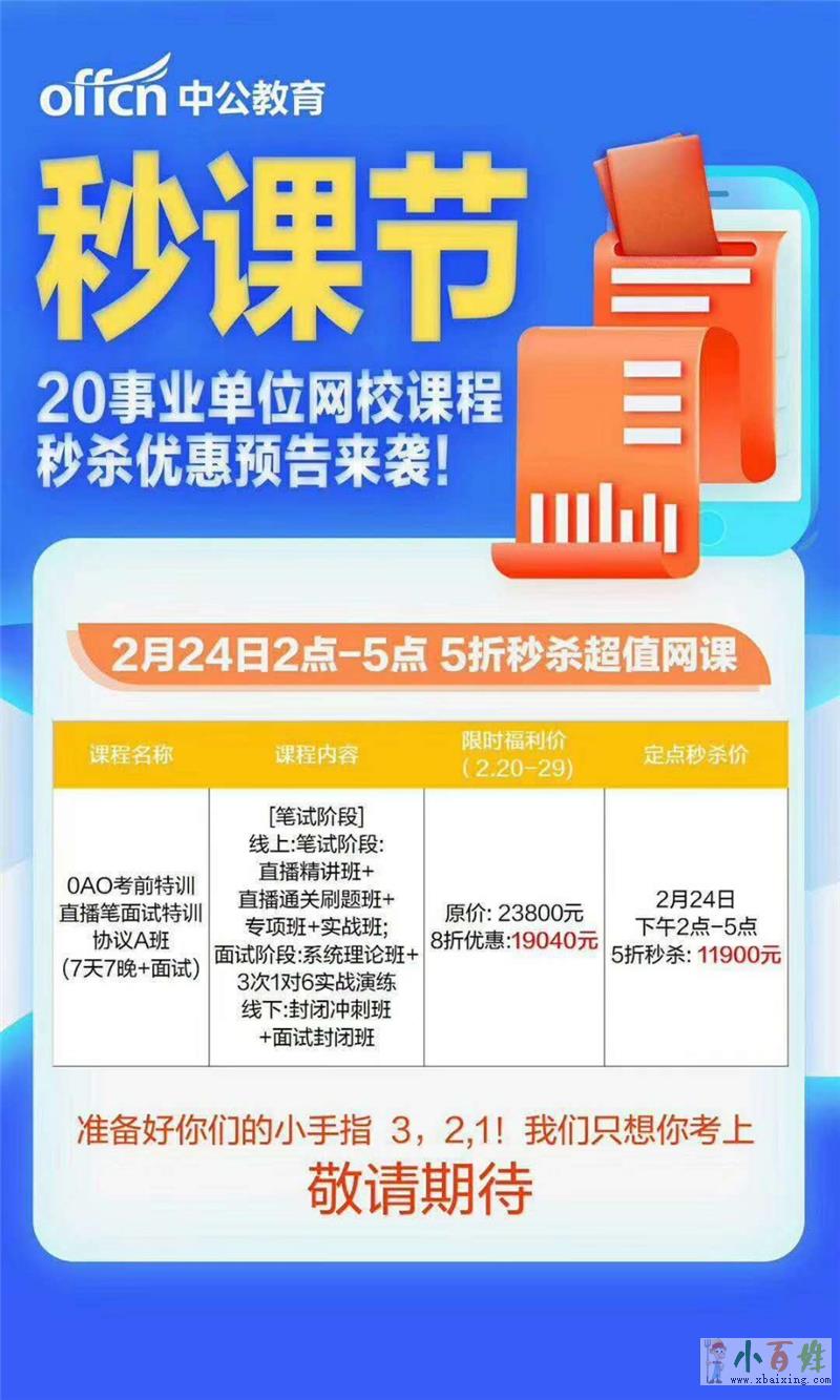 事业单位半价课程就一款,还可以多一点吗?限时秒杀,满足你又一课程钜惠来袭2月20日—2月29日,限时8折优惠2月24日14:00—17:00,定点秒杀价:5折!5折!5折!...